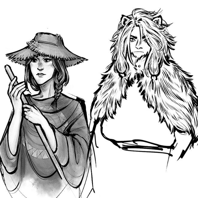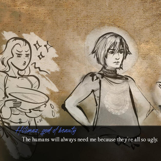 ArtThe first thing Willow did was recruit her best artist pal Morgana Johnson, who had worked with her on previous projects. She then sent Morgana incredibly nonsensical notes on character descriptions, but thankfully she and Morgana are drift compatible and Morgana designed the characters perfectly. They agreed upon an inky art style that resembles tapestries and paintings, and pulled design elements from a variety of ancient styles and mythologies. The goal of the game was to combine mythemes in a way that the game reads "mythological" without being set within a specific pre-existing pantheon.