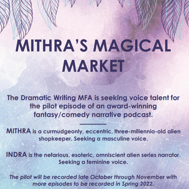 CastingCasting was done entirely by Willow Onken and entirely remotely, as campus was still shut down due to COVID-19. The pandemic was one reason, among many, that the production was pitched as a podcast. Character breakdowns and sides were posted, and after outreach to the theatre department, local theatres, and social media, the auditions came rolling in—over seventy of them! Eventually, the project found its lead cast: Steven Horn as Mithra, Lourdes Westbrock as Gwyn, and Megan Marks as the narrator Indra.