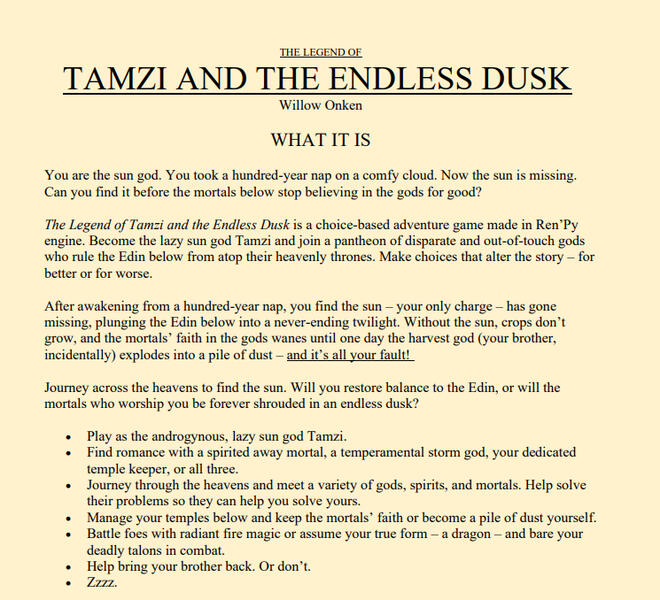 Become the lazy sun god Tamzi and join a pantheon of disparate and out-of-touch gods who rule the Edin below from atop their heavenly thrones in The Legend of Tamzi and the Endless Dusk, a Ren'Py interactive visual novel made created by Willow Onken with artist Morgana Johnson. Can you find the missing sun before the mortal realm is overcome by an endless dusk?