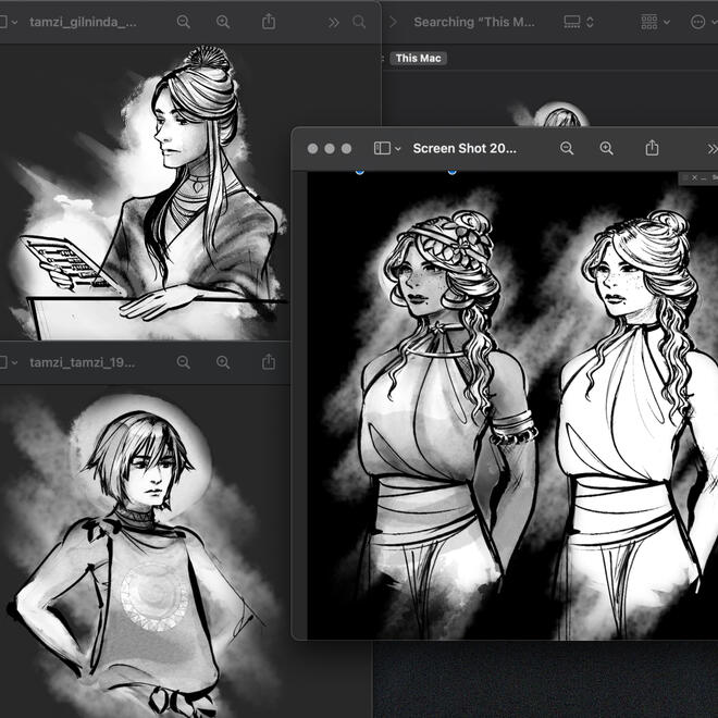 ArtThe first thing Willow did was recruit her best artist pal Morgana Johnson, who had worked with her on previous projects. She then sent Morgana incredibly nonsensical notes on character descriptions, but thankfully she and Morgana are drift compatible and Morgana designed the characters perfectly. They agreed upon an inky art style that resembles tapestries and paintings, and pulled design elements from a variety of ancient styles and mythologies. The goal of the game was to combine mythemes in a way that the game reads "mythological" without being set within a specific pre-existing pantheon.