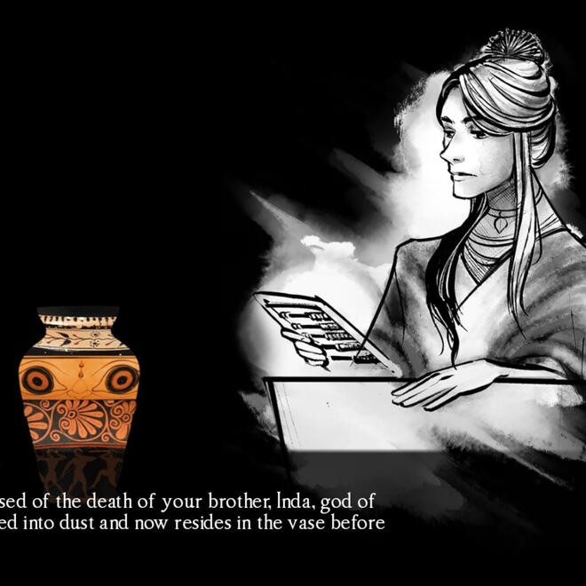 ArtThe first thing Willow did was recruit her best artist pal Morgana Johnson, who had worked with her on previous projects. She then sent Morgana incredibly nonsensical notes on character descriptions, but thankfully she and Morgana are drift compatible and Morgana designed the characters perfectly. They agreed upon an inky art style that resembles tapestries and paintings, and pulled design elements from a variety of ancient styles and mythologies. The goal of the game was to combine mythemes in a way that the game reads "mythological" without being set within a specific pre-existing pantheon.